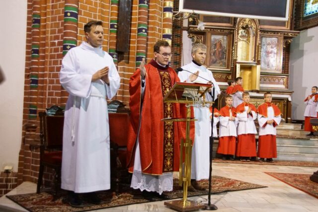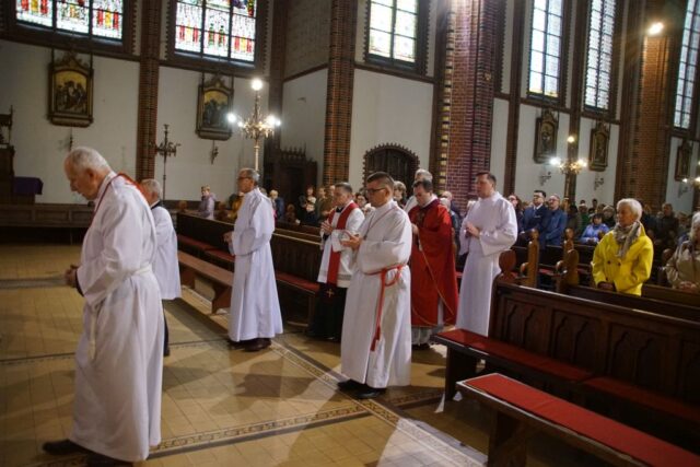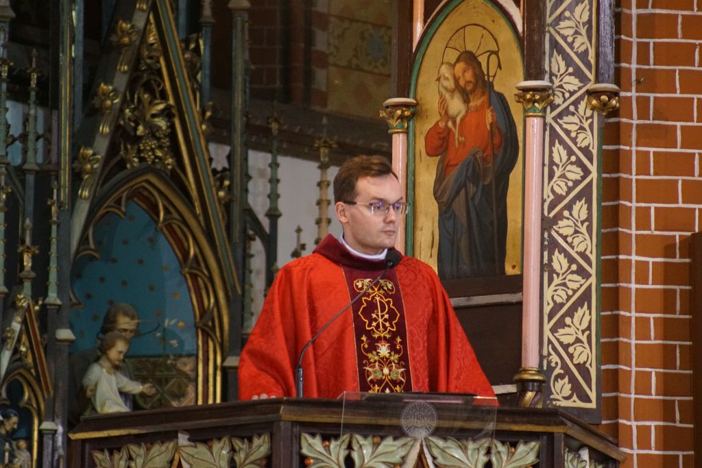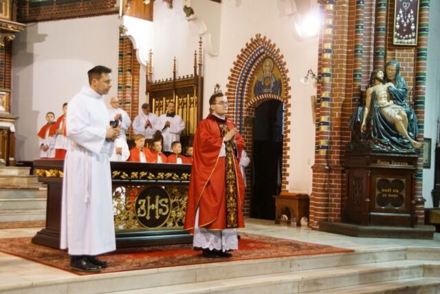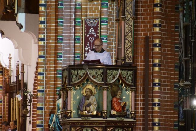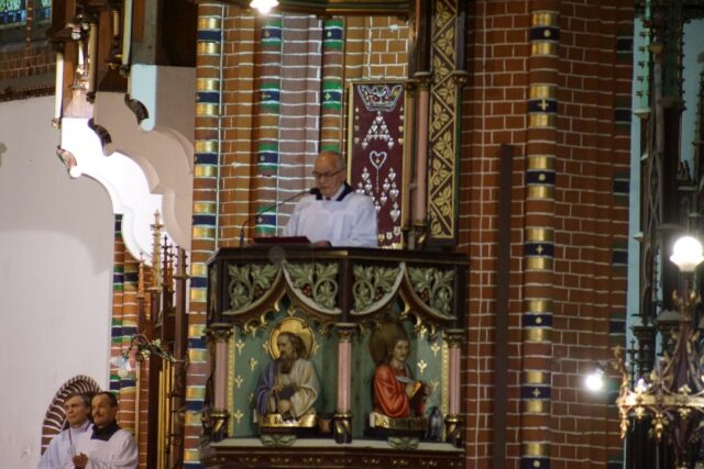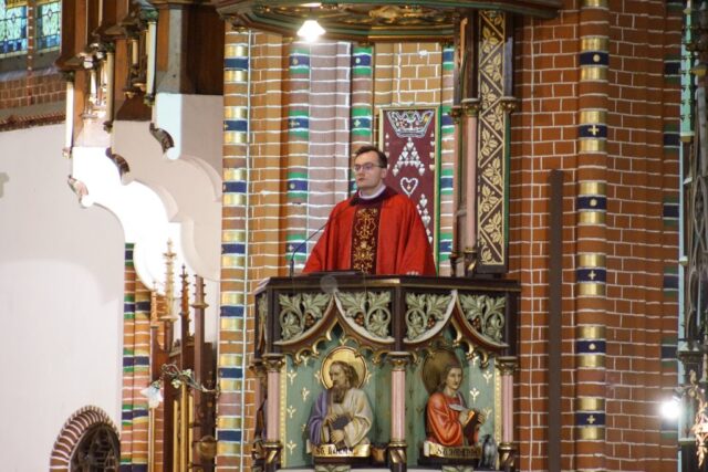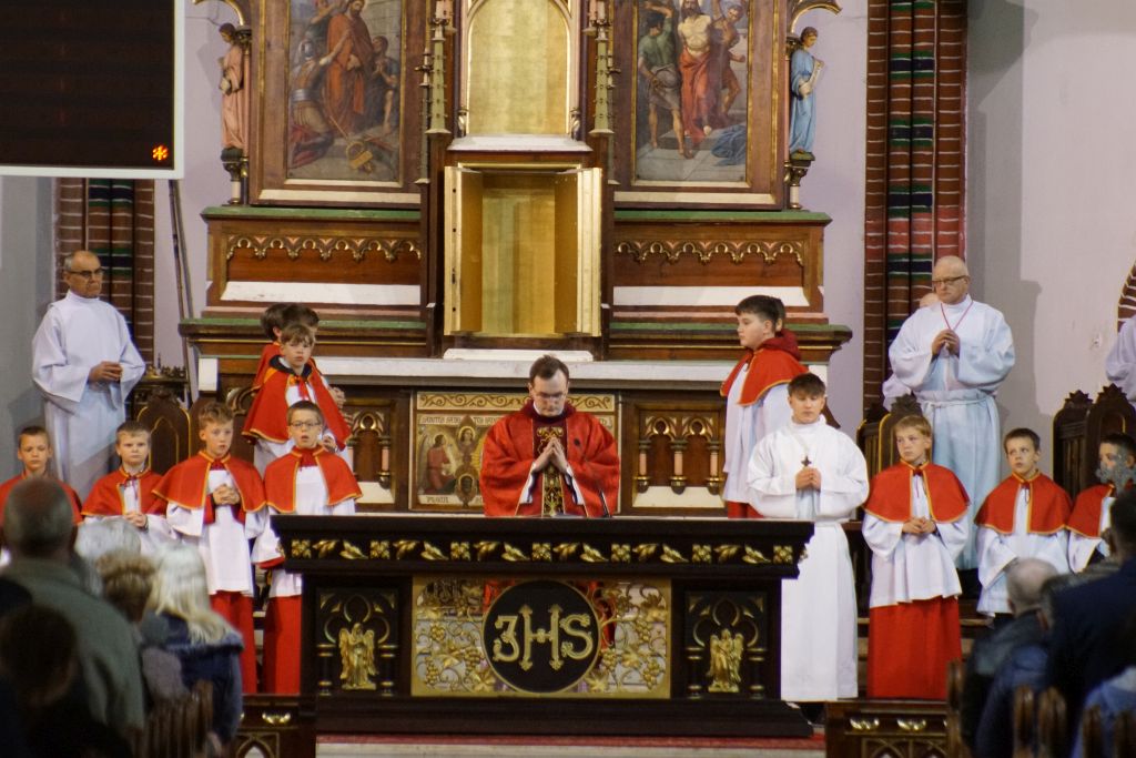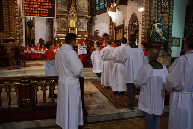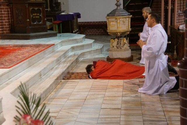 Nabożeństwo rozpoczęło się w absolutnej ciszy. Celebrans ks. Daniel Kołodziejczyk wszedł do świątyni w milczeniu, po czym upadł na twarz przed ołtarzem w geście pokory i uniżenia wobec tajemnicy Krzyża. To poruszające wejście wprowadziło wszystkich zebranych w atmosferę głębokiego skupienia i modlitwy.