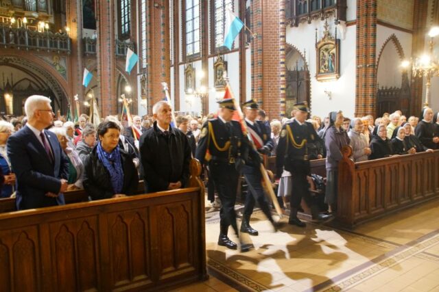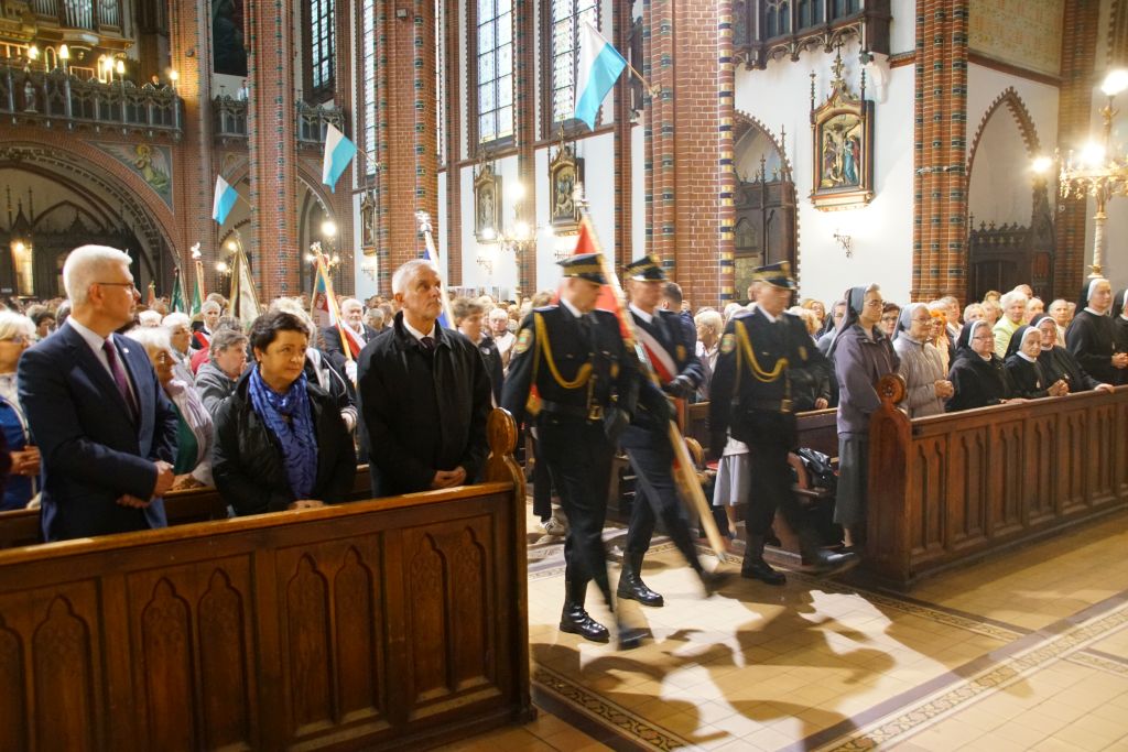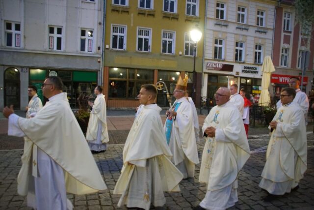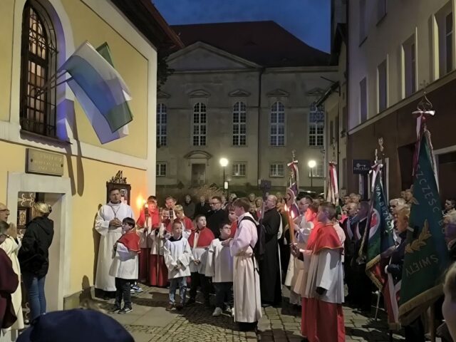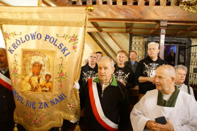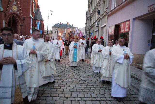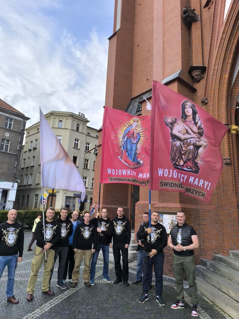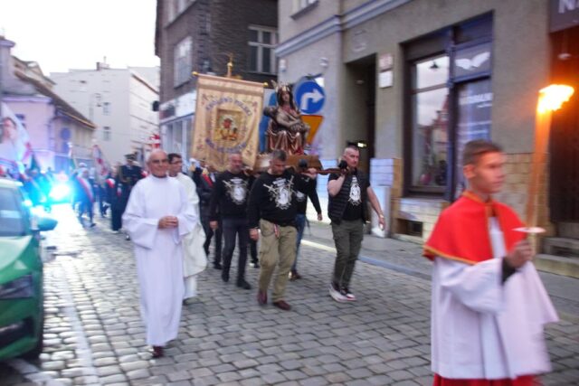 Po zakończonej Eucharystii wierni wraz z kapłanami przeszli w uroczystej procesji z figurą Matki Bożej Bolesnej do sanktuarium. Wojownicy Maryi nieśli feretron i sztandary z wizerunkiem Matki Bożej, które majestatycznie unosiły się ponad zgromadzonym ludem. Biskup Marek Mendyk dokonał aktu zawierzenia miasta Wałbrzycha Najświętszemu Sercu Jezusa i Niepokalanemu Sercu Maryi: