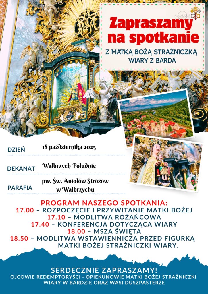 W sobotę, 18 października 2025 roku o godz. 17.00, w Kolegiacie Matki Bożej Bolesnej i Świętych Aniołów Stróżów w Wałbrzychu odbędzie się wyjątkowe modlitewne spotkanie zawierzenia Matce Bożej Strażniczce Wiary z Barda. To szczególny czas modlitwy, refleksji i odnowienia duchowego życia pod opieką Tej, która od wieków czuwa nad pielgrzymami i pomaga odnaleźć nadzieję tym, którzy zagubili się na ścieżkach wiary.