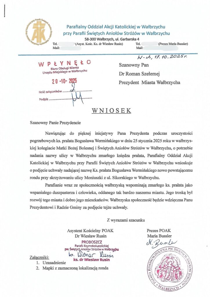 Parafialny Oddział Akcji Katolickiej działający przy parafii pw. Świętych Aniołów Stróżów w Wałbrzychu wystąpił z oficjalnym wnioskiem do Prezydenta Miasta Wałbrzycha o nadanie imienia ks. prałata Bogusława Wermińskiego nowo powstałemu rondu na skrzyżowaniu ulic Moniuszki i Sikorskiego.