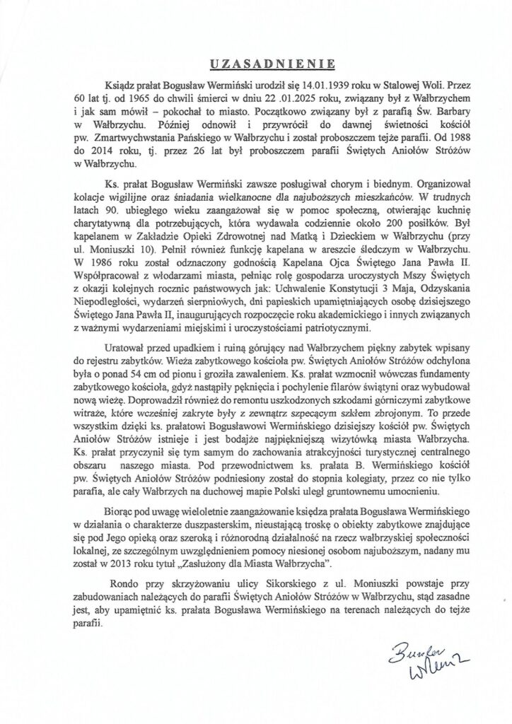 Propozycja ta ma szczególny wymiar symboliczny — rondo znajduje się w bezpośrednim sąsiedztwie parafii, w której ks. prałat Wermiński przez wiele lat pełnił posługę duszpasterską, pozostając jednocześnie jednym z najbardziej zasłużonych kapłanów w historii lokalnego Kościoła.
